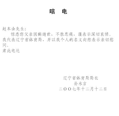 趙本山82歲的老父親趙德仁老先生12月11日19:20左右因肺癌離世,得知這一消息沈陽網(wǎng)記者聯(lián)系到遼寧省體育局孫永言局長(zhǎng)。孫局長(zhǎng)說,趙本山曾擔(dān)任遼足董事長(zhǎng),為遼寧足球事業(yè)作出了貢獻(xiàn),由于自己正在北京開會(huì)不能親自吊唁,委托沈陽網(wǎng)給趙本山發(fā)來唁電,全文如下: