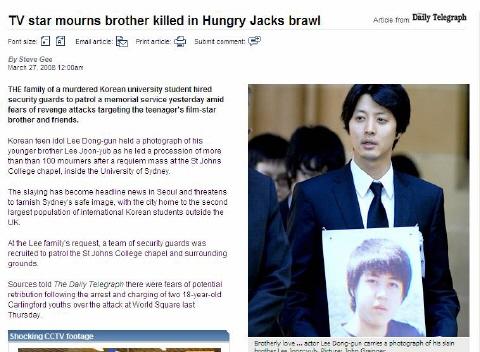 3月26日,李東健的弟弟生前就讀的悉尼大學(xué)的韓人留學(xué)生會,在學(xué)校某教堂內(nèi)為其安排追悼彌撒。李東健及其家人前來參加。