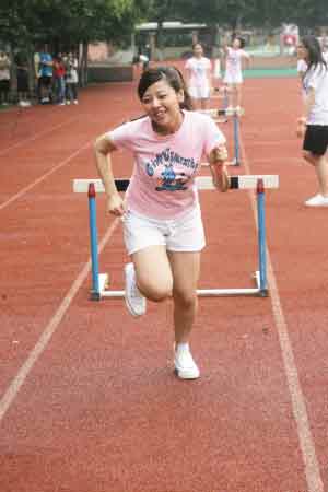 而接下來(lái)的跨欄更是讓人笑彎了腰,除了大牙和小蠻這兩個(gè)身高腿長(zhǎng)的美眉能一跨而過(guò),其他人都是慢吞吞地“走欄”——一腳跨過(guò)去,站定后另一腳才跨,特別是MeiMei,跑步的笨拙姿勢(shì)讓大家大笑不已。而到跳高時(shí),鬼鬼幾乎是連攀帶爬,姿勢(shì)十分狼狽,難得她躍過(guò)后還露出自信的微笑。而筱婕、小蠻和Apple都是雙手?jǐn)偲,企圖正面跳過(guò)去,可是每次都落得個(gè)肚子壓住橫竿的結(jié)局,被黑人揶揄為“狗爬式。”
