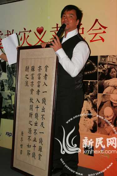 不過(guò),在當(dāng)晚的抗震救災(zāi)義賣(mài)晚會(huì)上,唐季禮笑得合不攏嘴。他的兩幅書(shū)法被拍到了18萬(wàn)7千元。唐季禮表示,大家都想為災(zāi)區(qū)做點(diǎn)事情,希望這次的義賣(mài)可以得到更多的善款支援災(zāi)區(qū)。