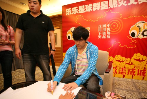 由周杰倫和潘瑋柏在現(xiàn)場為其精心挑選的義賣品簽字拉開了此次活動的序幕。當晚,周杰倫和潘瑋柏不顧全天工作的辛苦和旅途勞累,積極參加了“樂樂星球群星賑災義賣活動”。