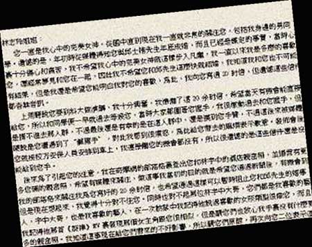 “八卦天王”還在信中向外界透露,自己就是林志玲遭遇“咸豬手”幕后的“真兇”。他稱,在林志玲到訪臺科技大學演講那天,他只是出于對偶像的愛慕之情,想接觸一下偶像并和她握手,由于太多人圍堵林志玲,所以他僅在人群中伸手摸到林志玲手臂,并非網上所傳聞的敏感部位。