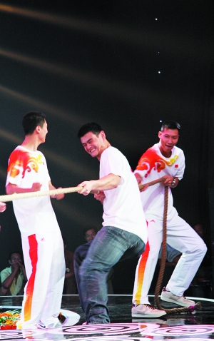 林浩向姚明挑戰(zhàn)拔河。林班長(zhǎng)身后站著四個(gè)孩童,而繩索另一端,是姚明和易建聯(lián)。5個(gè)孩子用盡全力,不敵兩位籃球“巨人”,頑童隊(duì)伍增加到8人,“姚易”手中繩索仍紋絲不動(dòng)。再增至15人,姚易終于敗下陣來(lái),“汗都下來(lái)了”姚明擦著額頭。而孩子們則歡呼“團(tuán)結(jié)力量大”。