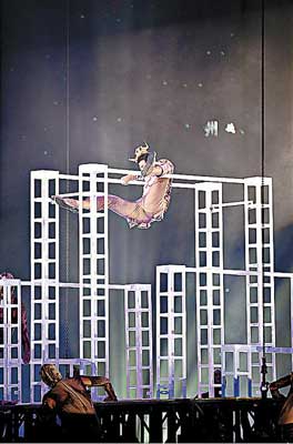 郭富城穿著由張叔平設(shè)計的新裝火紅閃閃“愛的戰(zhàn)衣”大唱情歌,更祝愿觀眾鴻運當(dāng)頭。郭富城自彈自唱環(huán)節(jié)雖彈錯了數(shù)個音,但也應(yīng)觀眾要求再彈奏鋼琴,郭富城唱至《狂野之城》一曲還大秀好身材,演唱會上還有郭富城好友的兒子沖破保安防線,上臺獻花給他,至于架上體操歌舞環(huán)節(jié)更因絆腳險跌,郭富城即用力支撐身體繼續(xù)演出。