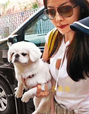 熊黛林抱著小狗離開城城住宅,看來有點(diǎn)匆忙,胸前的衫鈕還沒扣好。