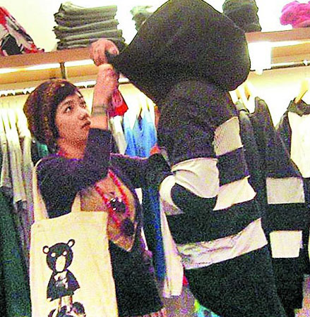 兩人在服飾店挑衣服,她調(diào)皮地將頭套封住捉弄Allen。