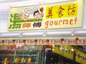 在網(wǎng)上搜索,“湯師傅”美食坊招牌十分卡通,用湯鎮(zhèn)業(yè)湯鎮(zhèn)宗兩兄弟的頭像戴上廚師帽做主造型,店里也掛滿了兩人同眾多明星的合影。