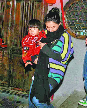 體態(tài)飄孕味的張柏芝抱兒子Lucas為老公新片慶功。