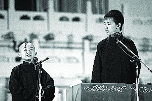 昨晚演出前大會堂門口的黃牛黨多數(shù)都在收票,演出開場后原價票依然還有人肯買。演出舞臺裝飾成天壇的樣子,讓北京觀眾感到相當親切。郭德綱兒子郭麒麟和義子陶陽開場就說了《學雜唱》,這個段子主要表現(xiàn)演員對各種戲曲唱段掌握程度,比相聲臺高一點點的郭麒麟不僅將梅葆玖、袁世海等名角唱腔模仿得很像,而且現(xiàn)場還唱起了流行歌曲,此外口才也相當了得,不少觀眾感嘆“還是有郭德綱的遺傳基因,天賦不俗!