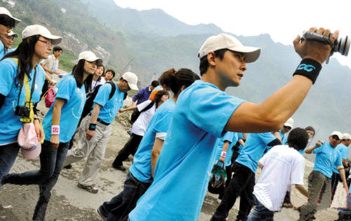 到了牛眠溝終點后,眾明星紛紛跟隨李連杰登上之前已搭好的舞臺,完成最后的儀式。來自映秀的羌族婦女為李連杰掛上了蘊含著祝福之意的羌紅。這時,主持人宣布當天共有一百萬網(wǎng)民通過網(wǎng)絡(luò)進行了虛擬行走,以此支持“壹家人,壹起走”活動,并現(xiàn)場成立了“志愿聯(lián)盟”。最后,在李連杰的帶領(lǐng)下,全場200多人默哀一分鐘,以表示對逝者的懷念。(王尚)