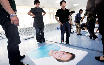 上午10時許,大廳入口處已經(jīng)擺開一排長桌,工作人員正對著筆記本挑選羅京的相片,仔細(xì)確認(rèn)相片的尺寸后,交代人員去打印以備布置靈堂之用。