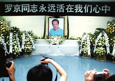 靈堂里擺放著50個(gè)花圈。正中間的花圈上寫著:“羅京,我們永遠(yuǎn)懷念你”,落款為“愛妻繼紅率子桐敬獻(xiàn)”。