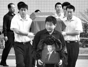 追悼會現(xiàn)場,水晶玻璃棺材四周布置著上萬朵百合花、白玫瑰花,靈堂肅穆安靜,羅京身著黑色西服、彩色領帶,遺態(tài)安詳。羅京妻子、愛子,以及所有親屬排成一列,陪伴羅京走完最后一程。羅京的妻子面容憔悴,低頭不語。靈堂外挽聯(lián)橫批“沉痛悼念羅京同志”。由于現(xiàn)場前來的群眾太多,工作人員不得不細心地提醒大家,“咱們就不鞠躬了,看一看羅老師就走,謝謝大家配合!