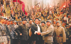 在小細節(jié)上,《解放》細節(jié)選取有度。或軼聞,或八卦,或慷慨激昂,或催人淚下,每一個細節(jié)的選取都有著特殊的意義。毛澤東與兒女的親密中展現(xiàn)出溫馨和諧的畫面。聞一多那篇中學(xué)課本選入的演講詞,觀眾均耳熟能詳,在《解放》中得以慷慨激昂地重現(xiàn),聞一多仰天長嘯,最終死在槍下,電視劇中的悲憤情緒渲染到極致,令人震撼。細節(jié)上的細膩還見諸于片頭設(shè)計的單色長畫卷,紅色畫面中連續(xù)展現(xiàn)了三年解放戰(zhàn)爭的開篇到結(jié)束,以中原突圍開始,到百萬雄師過大江終止,凸顯歷史的厚重深沉之感。