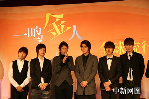 中新網11月16日電 (李季) 16日下午,來自馬來西亞的光良、韓國組合Super Junior—M、港臺藝人張韶涵、蕭亞軒、信和內地明星張杰、江映蓉在北京出席“一鳴金人—全球流行音樂金榜新聞發(fā)布會”,眾星紛紛為此活動獻上自己為精心準備的各種“金色”賀禮。