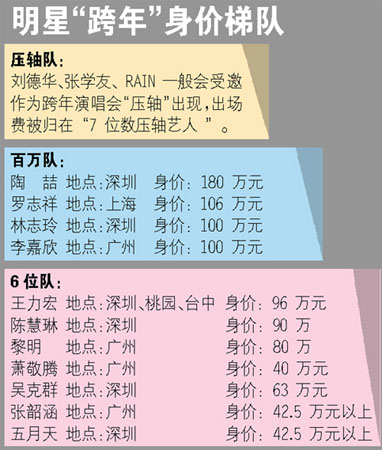 由于圣誕和元旦雙節(jié)即將到來(lái),港臺(tái)和內(nèi)地明星馬上又要迎來(lái)一年一度的搶錢“尖峰時(shí)刻”。往年,臺(tái)灣地區(qū)的明星基本以島內(nèi)“串場(chǎng)”為主, 元旦除夕晚從臺(tái)北一路南下,一個(gè)晚上坐飛機(jī)或直升機(jī)趕場(chǎng)賺錢。但今年起,大陸各大衛(wèi)視的跨年演唱會(huì)“搶星大戰(zhàn)”升級(jí),為港臺(tái)明星大開(kāi)“錢”途。僅北京、上海、廣州、深圳等幾大城市舉辦的跨年秀已讓港臺(tái)明星跑到腳軟,且這些電視臺(tái)開(kāi)出的價(jià)格大大高出臺(tái)灣或者香港同樣活動(dòng)的報(bào)價(jià),因此內(nèi)地地區(qū)的跨年活動(dòng)明顯更有吸引力。