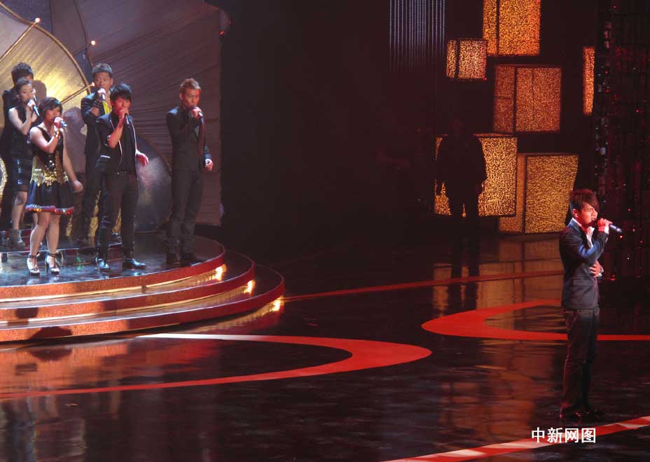 圖為臺灣人氣歌手曹格率領(lǐng)香港歌唱選秀節(jié)目《超級巨星》的參賽者表演歌曲聯(lián)唱,為港姐決賽助興。(攝影:余瑞東)