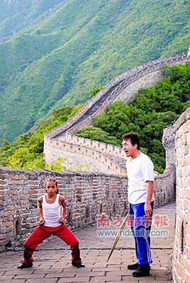 由成龍和威爾·史密斯的兒子賈登·史密斯(JadenSmith)主演的《功夫夢(mèng)》(The Karate Kids)近日曝光了幾張官方劇照,畫面所見,成龍?jiān)陂L(zhǎng)城上訓(xùn)練賈登·史密斯,小子架勢(shì)十足。該片由中影集團(tuán)、索尼·哥倫比亞和威爾·史密斯(Will Smith)旗下的Overbrook娛樂公司聯(lián)合投資拍攝,將于明年6月11日在北美公映,中國(guó)也將同步引進(jìn)。