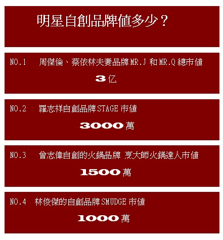 而針對這種明星以自己名義創(chuàng)立品牌的現(xiàn)象,究竟明星們的品牌價值值多少?為此記者特意采訪了知名品牌管理學者的楊教授,據(jù)楊教授解釋:由于藝人本身具有較高的社會知名度和形象的度,因此藝人創(chuàng)意品牌的價值起點都會比普通人高出好幾倍,因此藝人的知名度和形象度與其創(chuàng)立的品牌價值是密切相關,從某種意義上成正比關系,而對娛樂圈的一些藝人及其自創(chuàng)品牌,楊教授也給出一個系統(tǒng)的市值評估,如羅志祥的自創(chuàng)品牌STAGE市值 3000萬,林俊杰的自創(chuàng)品牌SMUDGE市值1000萬,曾志偉自創(chuàng)的火鍋品牌烹大師火鍋達人市值1500萬,而周杰倫與蔡依林這次合伙經營的MR.J和MR.Q市值,楊教授也給出了一個值得參考的數(shù)據(jù)3億。