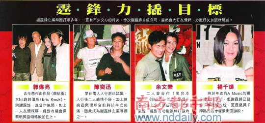 謝霆鋒自組公司的傳聞不是一天兩天的事兒了,昨天新鮮出爐的香港某周刊又重提“舊事”,稱盡管英皇開出不少優(yōu)越條件留人,但謝霆鋒“去意已決”,而老婆張柏芝亦是“無限量支持”,當(dāng)做新公司第一簽約藝人。據(jù)稱謝霆鋒心中已有不少“挖墻腳”的人選,目標(biāo)包括陳奕迅、楊千女華、余文樂等一幫友人,楊千女華對(duì)此以“還沒正式談,我自己都還不知道,告訴你什么呢?”作回應(yīng)。———謝霆鋒與英皇的合約尚未到期,為何老刮“跳槽”這陣風(fēng)?恐怕是:管它真亦假,先炒再說!