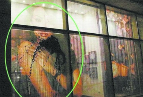 過了大概半個(gè)小時(shí)的樣子,這輛車又開到了酒店門前,車上下來了兩個(gè)用帽子遮著臉的男子,他們手里拿著墨汁,走到酒店東側(cè)一間鉑金店的門前,對(duì)著櫥窗里的章子怡代言海報(bào),將墨汁潑了上去,然后撒腿跑上了車。之后,這輛車?yán)瘓?bào)飛快離開了酒店,門前的記者和保安都被這一幕弄得有點(diǎn)莫名其妙。