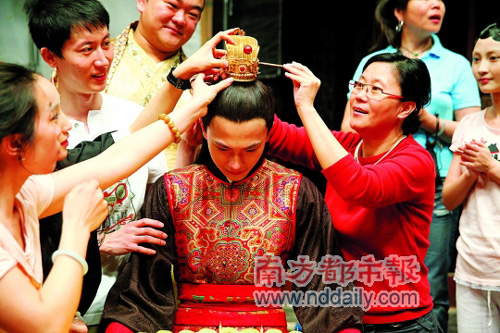 李少紅執(zhí)導(dǎo)的新版《紅樓夢(mèng)》歷經(jīng)一年三個(gè)半月的緊張拍攝,終于在昨日殺青。“寶玉”楊洋也在這一天迎來(lái)了自己的18歲成年生日。昨日,劇組殺青之日,導(dǎo)演李少紅與近百名演職人員一起,為“成年寶玉”楊洋舉行了熱鬧的成人禮。李少紅親手為楊洋摘下通靈寶玉,象征劇組正式殺青;隨后,李少紅又為楊洋戴上金冠,取意“加冠成人”(左圖)。楊洋感動(dòng)得語(yǔ)帶哽咽:“18歲生日在劇組度過(guò),我覺(jué)得很有意義。它對(duì)劇組的拍攝工作是一個(gè)圓滿(mǎn)的終點(diǎn),但對(duì)于我個(gè)人來(lái)說(shuō),卻是人生新的起點(diǎn)!