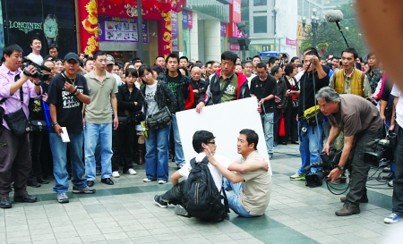 上午10點10分,記者趕到現(xiàn)場時,解放碑下已經(jīng)聚集了數(shù)百群眾,不少人正在熱烈討論:“費力抓到個小偷,結(jié)果是在拍戲嗦!痹瓉恚蛱斓膽蚍菔前缪輳垏⑽璧咐蠋煹捻n雨芹正在逛街,錢包被小偷偷了,“暗戀”老師的張國立發(fā)現(xiàn)后,奮勇抓住了小偷。一位工作人員告訴記者,一開始拍攝的是遠景,出場的是身著張國立同樣服裝的替身演員,為求真實,攝影機和工作人員都離得比較遠,現(xiàn)場非常不好控制。記者看到,每當(dāng)替身演員大喊抓小偷時,本該由扮演路人的演員出場一起圍抓小偷,誰知總有不少路人以為真有“小偷”,上百人一擁而上,還有的出手打“小偷”,導(dǎo)演不得不數(shù)次叫停,最后連張國立都上前來營救“小偷”。