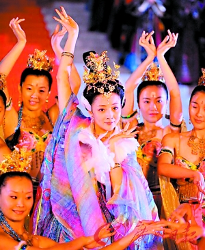 在《楊貴妃秘史》的拍攝基地,記者們首次看到了該劇剛剛制作完成的40分鐘片段。在片花中,演員們?nèi)A麗的服飾十分搶眼,“霓裳羽衣舞”也得到了完整展示,尤小剛表示,片中的舞蹈段落非常多,全劇拍攝的4個(gè)月中,舞蹈團(tuán)隊(duì)就跟了三個(gè)半月,“大家都以為拍古裝戲,打仗的場(chǎng)面最難拍,其實(shí)不然。拍攝這部劇最難的是在復(fù)原很多鮮為人知的唐朝文化細(xì)節(jié)。觀眾在這部劇中可以看到數(shù)百人組成的唐代宮廷樂(lè)隊(duì),黃秋生扮演的李隆基也表演了好幾段舞蹈。”