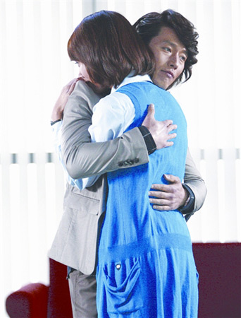 內(nèi)心戲是考量演員的重要指標(biāo)。遠(yuǎn)遠(yuǎn)地,穿著淺藍(lán)襯衫加湖藍(lán)色針織背心的朱丹慢慢走著。一身西裝,扎著馬尾的張赫跟在她身后,隨后兩人交談了幾句,張赫便從背后一把摟住了朱丹,擁抱親吻。