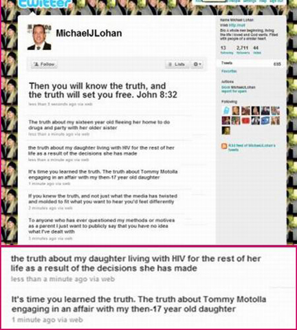 臺(tái)灣“今日新聞”報(bào)道稱,邁克爾在其微博上說,林賽現(xiàn)在的行徑會(huì)如此荒唐,完全是因?yàn)榈昧税滩,因此她決定就這樣渾渾噩噩過一生!但很快邁克爾卻突然將消息撤下,聲稱自己的微博網(wǎng)頁被黑客入侵,網(wǎng)頁上所言都不是事實(shí)。