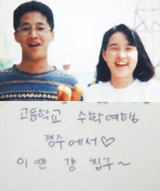 照片中的車太賢與崔錫恩每人手拿三個(gè)熱狗露出燦爛笑容,照片的背面寫著:“高中旅行在慶州♡。這時(shí)還只是朋友~!