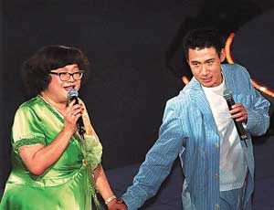 張學(xué)友在1987年就認(rèn)肥姐為干媽,兩人因?yàn)樵陔娪啊赌媳眿尨颉分酗椦菽缸佣Y(jié)緣。張學(xué)友無疑是肥姐最疼愛的干兒子,他直接叫肥姐“媽咪”,而肥姐則親昵地稱他“七仔”(張學(xué)友花名)。去年8月17日,病重的肥姐依然出席了張學(xué)友在香港的演唱會。而張學(xué)友則十分體貼地在臺上獻(xiàn)唱肥姐最喜歡的《輕撫你的臉》,并稱是特別獻(xiàn)唱這首歌送給最尊敬的長輩,因干媽第一次聽他的歌正是此曲。
