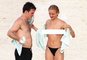照片中的兩人在沙灘上嬉戲的情景完全暴露在記者的膠片下,迪亞茲當(dāng)時只穿著黑色T-Back內(nèi)褲,上半身則一覽無余。