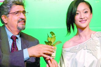 “大使”周迅首先給記者們“上了一課”:主辦方贈與每位與會者一盆小的盆栽植物,周迅拿起來看了看,說“綠色代表希望,這盆小植物是活的,請大家像愛護(hù)自己一樣愛護(hù)這個地球!苯又蝗灰庾R到什么,她揭去了植物外面包裹著的塑料袋并說道,“在生活中,我們盡量不要使用塑料袋!