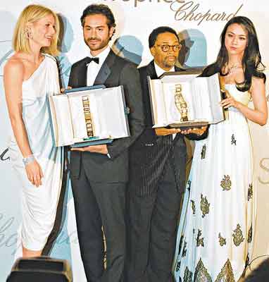 湯唯和Omar Metwally(左二)分別從導(dǎo)演斯派克·李(右二)和格溫妮絲·帕特洛(左一)手中領(lǐng)取獎(jiǎng)項(xiàng)。