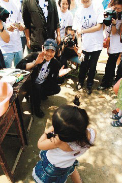 李連杰和災(zāi)區(qū)小朋友在一起。