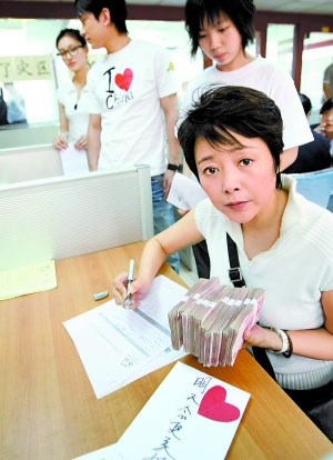前天,從寧波外景地直接趕回北京的著名演員張瑜,從北京機(jī)場直接來到中國扶貧基金會(huì),為汶川災(zāi)區(qū)的孩子們再捐10萬元善款。和張瑜一道同來的還有張瑜導(dǎo)演的電影《八十一格》的兩位青年主演王麗坤和王睿。張瑜說,10萬元對災(zāi)區(qū)人們來說,也許是杯水車薪,但現(xiàn)在災(zāi)區(qū)孩子需要的不僅僅是錢,他們更需要心靈醫(yī)治和撫慰。