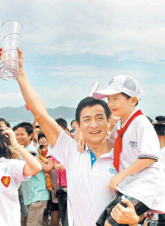 中新網(wǎng)6月6日電 據(jù)臺灣媒體報道,劉德華(華仔)日前帶著80名災(zāi)區(qū)小朋友,參加在海南島三亞灣舉辦的“汶水入海”四川賑災(zāi)活動。華仔與小朋友玩起5人6腳在500米長的沙灘上進行接力傳遞,華仔最后還抱起1名災(zāi)區(qū)小朋友,將象征愛心與祝福的汶川之水舉起倒入大海,完成儀式。
