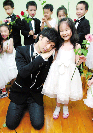 近日,古巨基為EMI特別企劃的國(guó)語(yǔ)新專(zhuān)輯“《小甜蜜》百人愛(ài)情見(jiàn)證”活動(dòng)專(zhuān)程前往托兒所挑花童。面對(duì)三四歲的小朋友,古巨基穿了一套看似正式的西裝,領(lǐng)結(jié)卻是一只小黑狗的造型。超級(jí)喜歡小朋友又很想當(dāng)爸爸的基仔,不管說(shuō)什么都能讓小朋友開(kāi)心大笑,功力不輸兒童節(jié)目主持人。他一句童音版的“我是古巨基啊”也引起小朋友的調(diào)侃,“你是古基基!”他開(kāi)心地表示:“如果以后我有了小孩,我有信心一定可以當(dāng)他最好的朋友!”