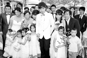 上周六,古巨基在臺(tái)北為十對(duì)新人進(jìn)行證婚。自喻為“愛(ài)情見(jiàn)證大使”的古巨基當(dāng)天也身穿白色禮服,手牽穿著小禮服的六歲小女友,帶領(lǐng)十對(duì)婚紗新人走紅毯?吹娇蓯(ài)的小花童和擔(dān)任他女伴的小女友以及十對(duì)美麗新人,古巨基被浪漫氣氛打動(dòng):“一直很想結(jié)婚啊!因?yàn)楹芟蛲闪⒓彝サ母杏X(jué),但可惜一直沒(méi)有遇到另一半!”雖然身邊的六歲小女伴私底下說(shuō)喜歡古巨基哥哥,但是當(dāng)古巨基當(dāng)著大家面前說(shuō):“我等你12年,你嫁給我好嗎?”時(shí),小女伴卻害羞地連續(xù)20多次推開(kāi)古巨基的麥克風(fēng),甚至還讓基仔撞到牙齒并且大呼“不要”,讓古巨基的求婚尷尬被拒。