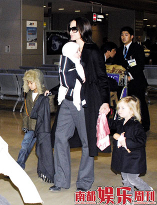 近日,好萊塢人氣情侶安吉麗娜·朱莉和布拉德·皮特赴日本為新片做宣傳。隨行的還有他們的幾個(gè)孩子:親生女希洛、來(lái)自柬埔寨的大養(yǎng)子麥多克斯、越南養(yǎng)子派斯汀、非洲養(yǎng)女薩哈拉,最令人驚喜的是,他們還帶上了去年七月剛剛誕下的一對(duì)龍鳳胎小寶貝。安吉麗娜將女兒薇薇妮背在胸前,皮特則背著兒子諾克斯,兩個(gè)小家伙都胖乎乎的,十分惹人喜愛(ài)。據(jù)美國(guó)《Star》雜志爆料,這對(duì)小寶寶生下后就體弱多病,而且是一種神秘的慢性疾病,因此皮特二人一直不讓他們現(xiàn)身露臉。安吉麗娜和皮特此行故意讓龍鳳胎寶貝大方曝光在鏡頭下,似有意要以寶寶真身?yè)魸⑦@種傳言。