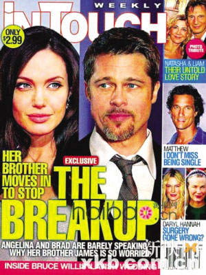 布拉德·皮特和安吉麗娜·朱莉的夢(mèng)幻愛情,似乎有幻滅的趨勢(shì)。最近,不止一家的美國(guó)雜志報(bào)道了兩人的感情危機(jī)。就連臺(tái)灣媒體也不甘示弱,報(bào)道中稱布拉德·皮特、安吉麗娜·朱莉關(guān)系陷入冰點(diǎn),兩人協(xié)議暫時(shí)分居。假如情勢(shì)無(wú)法挽回,小布將爭(zhēng)取六名子女的監(jiān)護(hù)權(quán),另外,高達(dá)2億美元的財(cái)產(chǎn)分配問(wèn)題,恐怕也會(huì)讓這對(duì)“史密斯夫婦”展開廝殺。