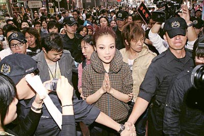 據(jù)香港明報報道,在派發(fā)海報時場面非;靵y,有否擔心人多混亂被偷摸?祖兒說她一直是做雙手護胸動作,而且Fans會自發(fā)性為她開路,她說:“Fans長大了,也不再像以前般瘋狂,不過助手都有被人拉扯!