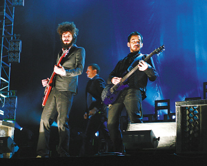 《One step closer》的吉他前奏在能容納2萬多人的虹口足球場內(nèi)響起時,幾乎所有的歌迷都站了起來,高喊著“Linkin Park”,盡管氣溫很低,但場內(nèi)氣氛卻已開始沸騰。昨晚,堪稱饒舌金屬樂界最耀眼的明星樂隊(duì)林肯公園的上海站演唱會在虹口足球場舉行,不僅場內(nèi)爆滿,許多買不到票的鐵桿歌迷甚至站在場外聽完全場;而此次上海演唱會也吸引了許多國內(nèi)歌手前來觀看,記者在場內(nèi)碰到的就有羽·泉、李泉、左小祖咒等。