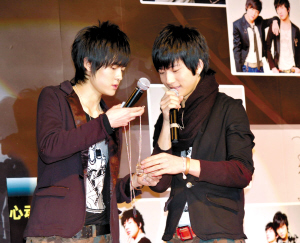 2007年10月22日,由“加油好男兒”的井柏然和付辛博組成的偶像團(tuán)體BOBO組合在北京舉辦了他們的首唱會(huì)。會(huì)上他們不僅載歌載舞與歌迷互動(dòng),還收到了大師兄羽泉組合送來的禮物。 中新社發(fā) 一可 攝