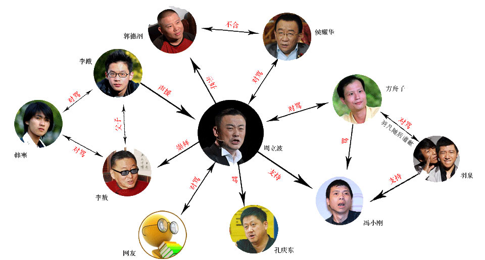 原本大家關(guān)注周立波是因為他的清口、他的八卦,現(xiàn)在關(guān)注周立波緣于他和網(wǎng)民們的一場口舌之戰(zhàn)!叭魧⒕W(wǎng)絡(luò)民意當真,實是一種‘自宮’行為”,周立波在微博上發(fā)聲后,隨即又提出“網(wǎng)絡(luò)公廁論”。在引起眾多網(wǎng)友的不滿后,“打假斗士”方舟子、孔慶東和葉匡正也被卷入其中。…… [詳細]