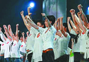 募捐晚會(huì)現(xiàn)場(chǎng),眾星齊唱《愛(ài)的奉獻(xiàn)》。 圖/央視國(guó)際