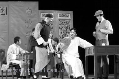 大幕拉開,一個以國寶“四羊方尊”被發(fā)現(xiàn)的真實故事改編的戲劇作品在舞臺上展開。幾個貪財?shù)奈奈镓溩樱瑸榱俗约旱呢澞罨ハ嗨阌。從結(jié)構(gòu)上看,都與平時觀看的話劇作品沒有什么兩樣。但是劇中人物說起臺詞來的感覺,跟戲劇就有了很大區(qū)別。抖包袱的方式就是借鑒了相聲的表現(xiàn)方式,有捧哏的還有逗哏的。人物的身份可以隨時跳進跳出。道具師傅可以掂著打鐵板到舞臺上展示“打雷”的效果。