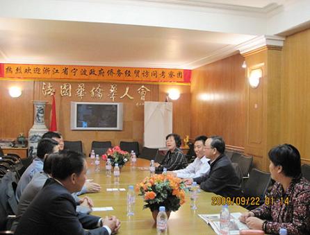在法國期間,訪問團(tuán)拜訪了法國華僑華人會。現(xiàn)任主席陳勝武及副主席張過祥、陳其躍等負(fù)責(zé)人,熱情接待了訪問團(tuán),相互進(jìn)行了座談;訪問團(tuán)還參觀了位于巴黎市中心四區(qū)的會所、文化中心,及中華文化學(xué)校。通過座談參觀,訪問團(tuán)了解到,近年來,隨著中國國力迅速增長,旅法華人地位不斷提高,華人也在改變過去不關(guān)心政治的慣例,正在努力融入當(dāng)?shù)刂髁魃鐣。訪問團(tuán)與法國華僑華人會互贈了禮品;法國歐華歷史學(xué)會會長葉星球還向訪問團(tuán)贈送了其撰寫的《法國華人三百年》一書。
