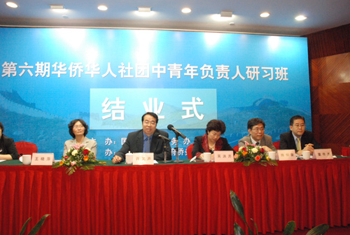 結(jié)業(yè)式前,許又聲與全體學(xué)員舉行了座談交流。來自北美洲、南太平洋地區(qū)9個(gè)國家和地區(qū)的48位僑團(tuán)中青年負(fù)責(zé)人圍繞“如何展示中國僑民新形象,為祖(籍)國增光添彩”這一主題進(jìn)行了深入而熱烈的討論,就進(jìn)一步融入主流社會(huì)、增進(jìn)與其他族裔溝通、關(guān)心和參與住在國政治生活、加強(qiáng)僑胞文明禮貌教育、促進(jìn)僑胞內(nèi)部團(tuán)結(jié)、共同建設(shè)和諧僑社等建言獻(xiàn)策。